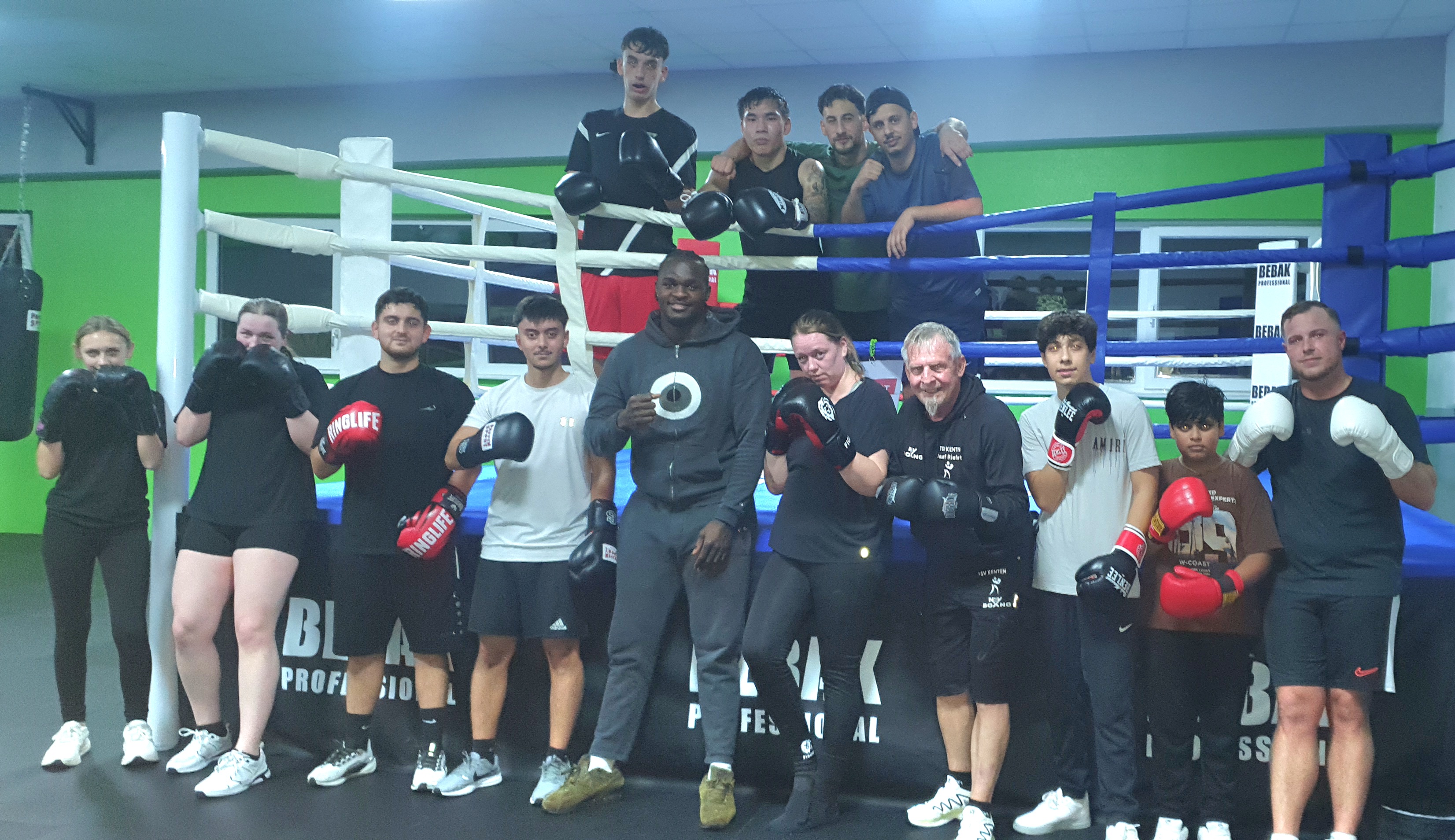 Olympiaboxer Nelvie Tiafack macht mit Josef Riefert Abteilungsleiter (Head Coach Inklusion) und dem TSV Kenten ein Box-Gym im Fitnesstudio Reallyfit auf.